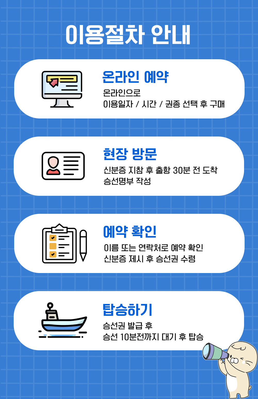 대기자가 많거나,승선절차가 지연될 경우 탑승을 못하실수 있으며,해당의 경우는 환불이 되지 않습니다.)