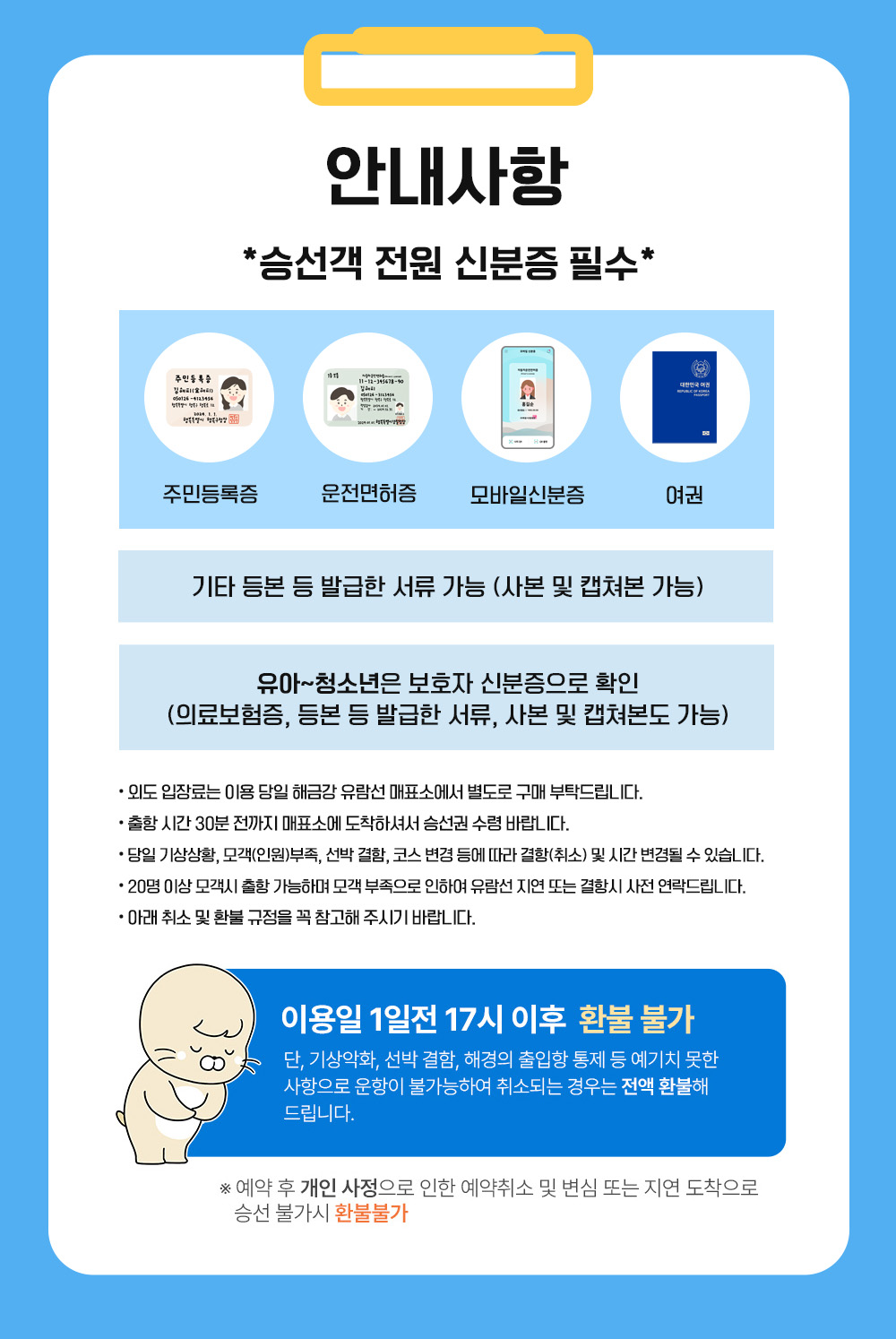 6.본 규정은 주식회사 하늘엔의 자사규정이며 승선 당일 위반 확인시 예약취소되며 약관위반으로 환불되지 않습니다.